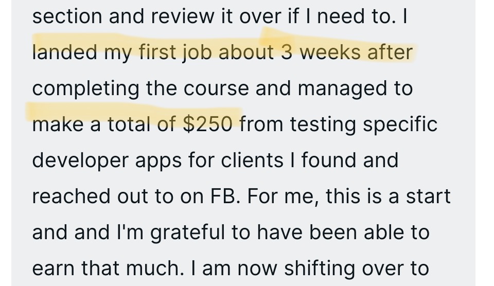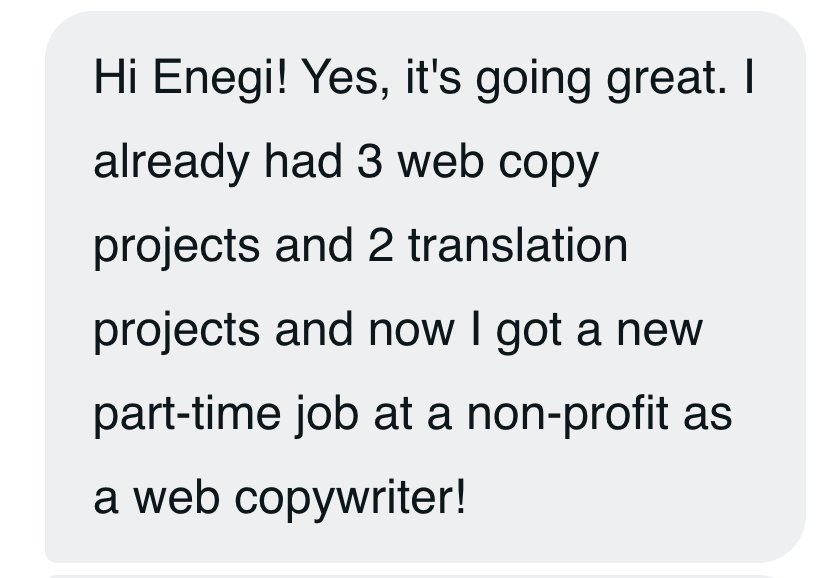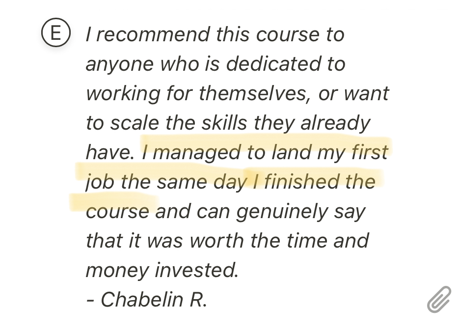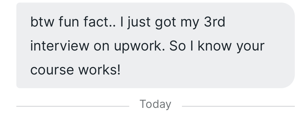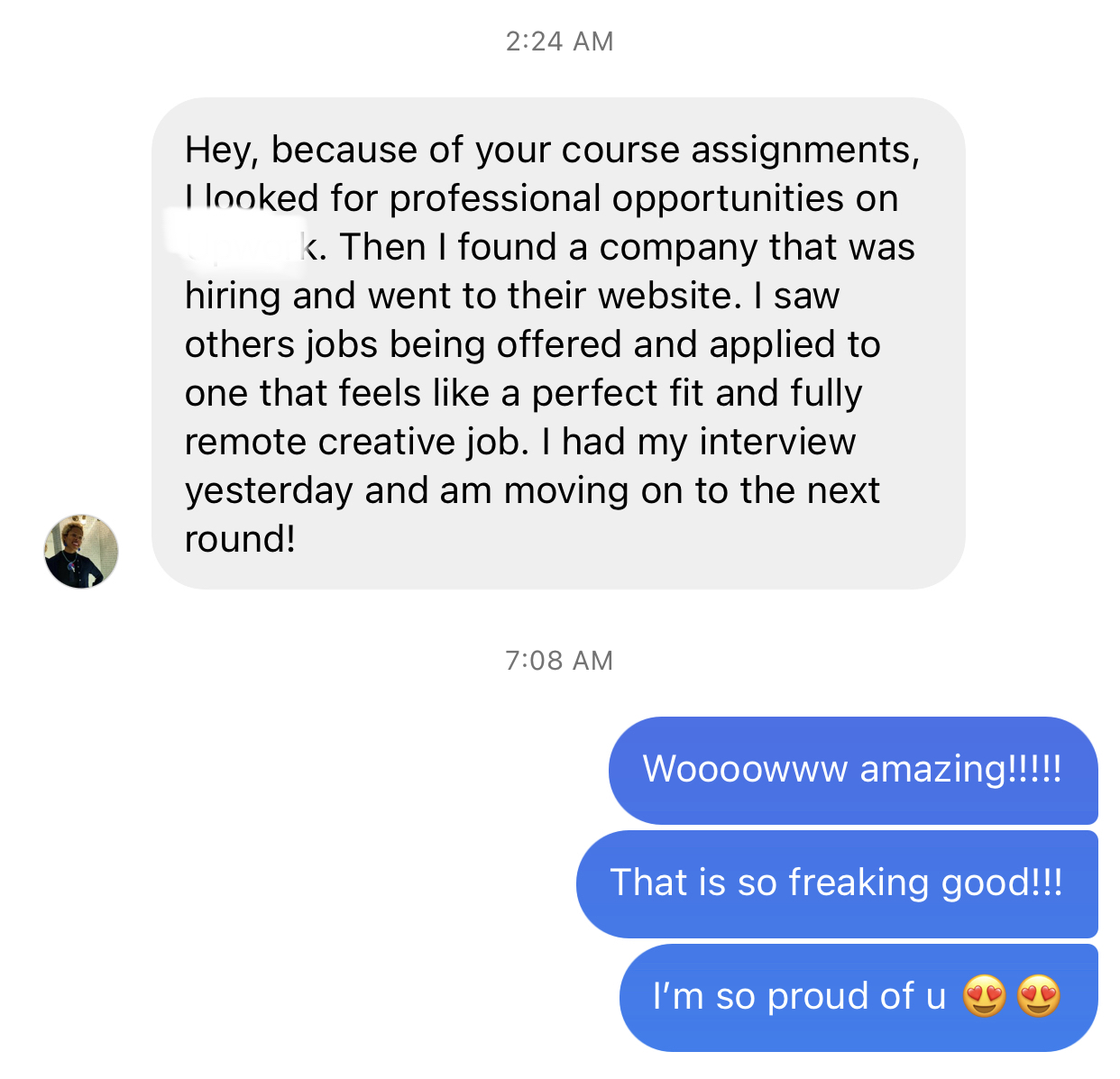This student was able to progress to the next round of her dream remote job because of the homework assignments in this course. Even though this course is focused on freelancing, it can still prepare you for traditional online jobs!