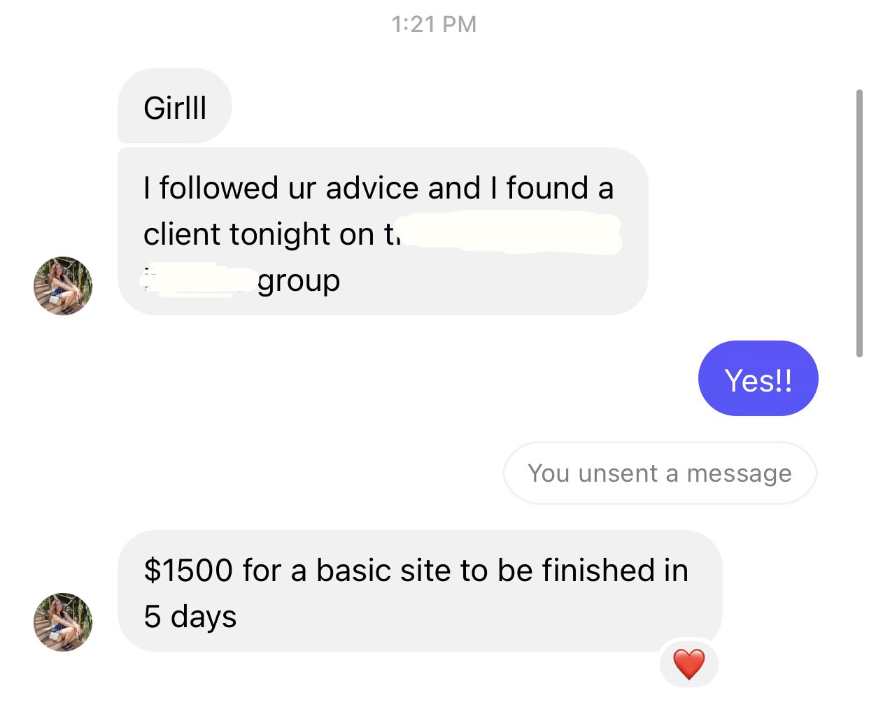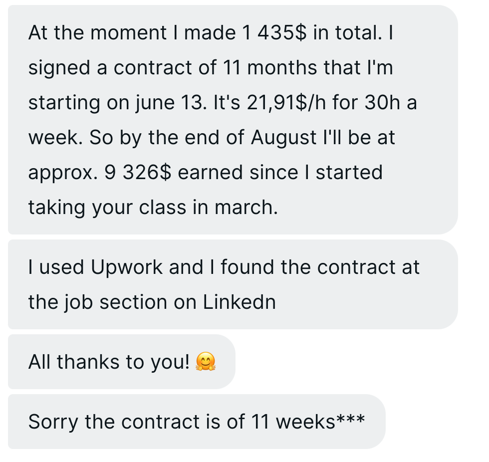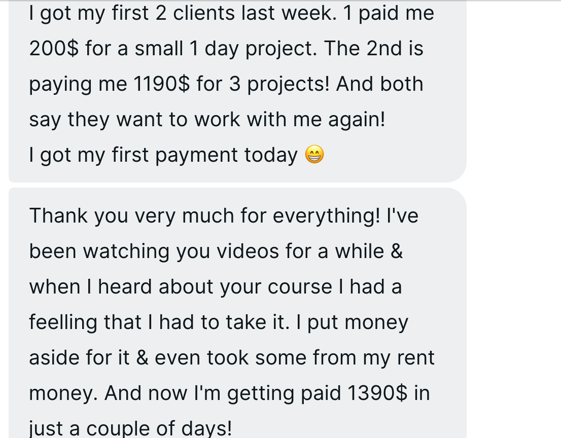 Following my advice, she got a client paying her $1500 for her skill. In this course, I tell you the exact places where you can find real paying clients. All you have to do is put in the work! This student is on track to make $10K just a couple months after finishing the course! Her life is completely changed.